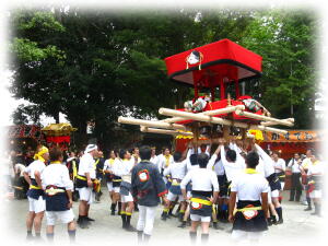 幟、四つ太鼓、屋台の順に宮芝へ入り、