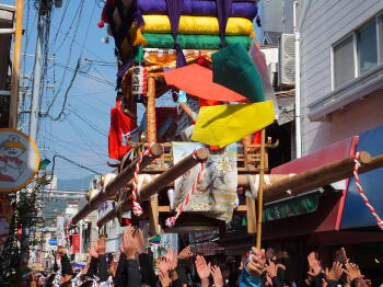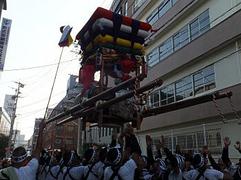 | −なんと、この太鼓台を高々と放り上げます! |
